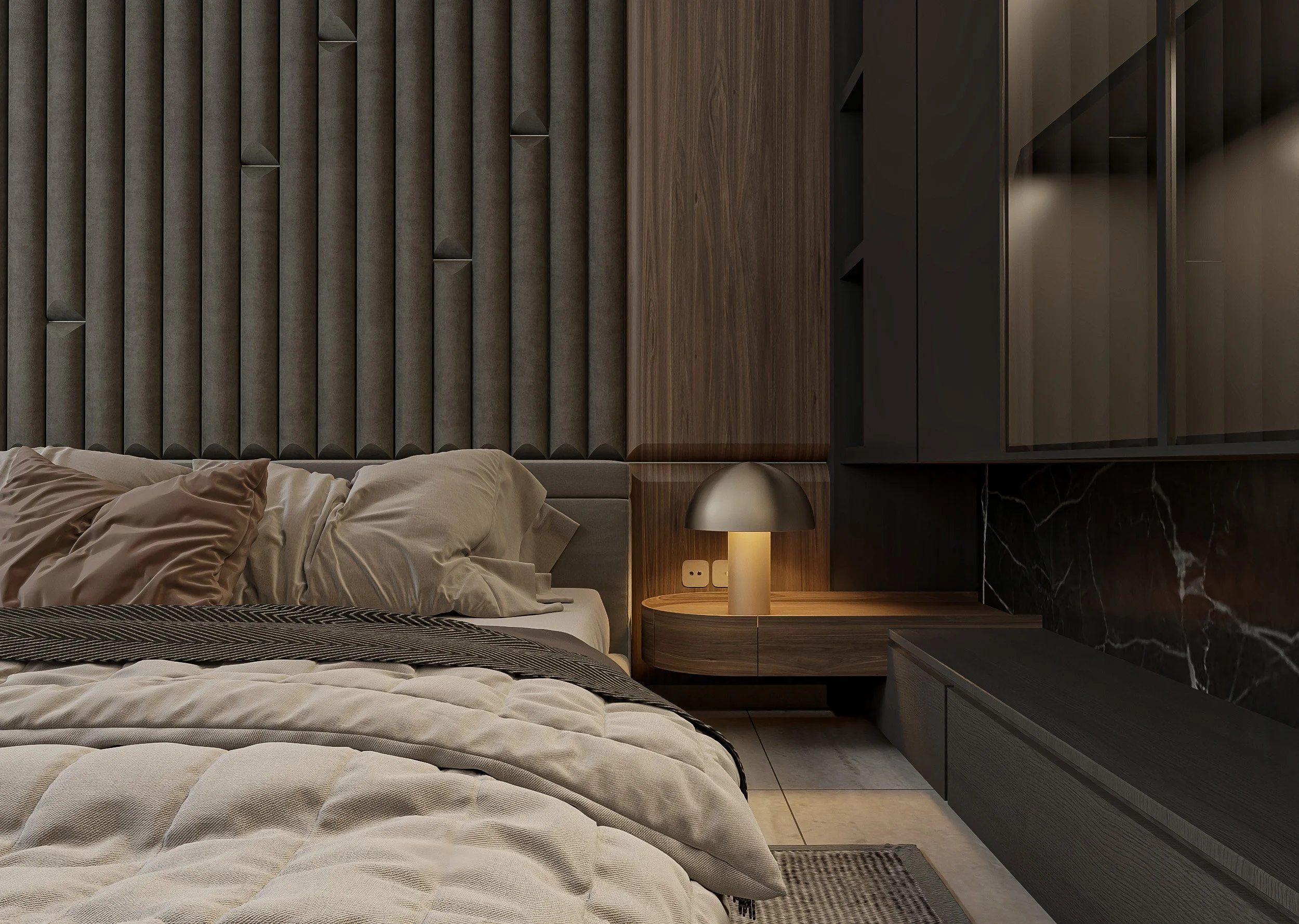 The Villa Suite captures the essence of refined hotel luxury within a private residence. The space combines rich textures, warm wood tones, and sleek contemporary lines to create a sense of calm sophistication. A soft, layered palette enhances the atmosphere of comfort, while subtle lighting accentuates the architectural details and adds depth to the design. The integrated lounge area and bespoke furnishings reflect a seamless balance between functionality and indulgence — transforming the bedroom into an elegant retreat that feels both intimate and grand.