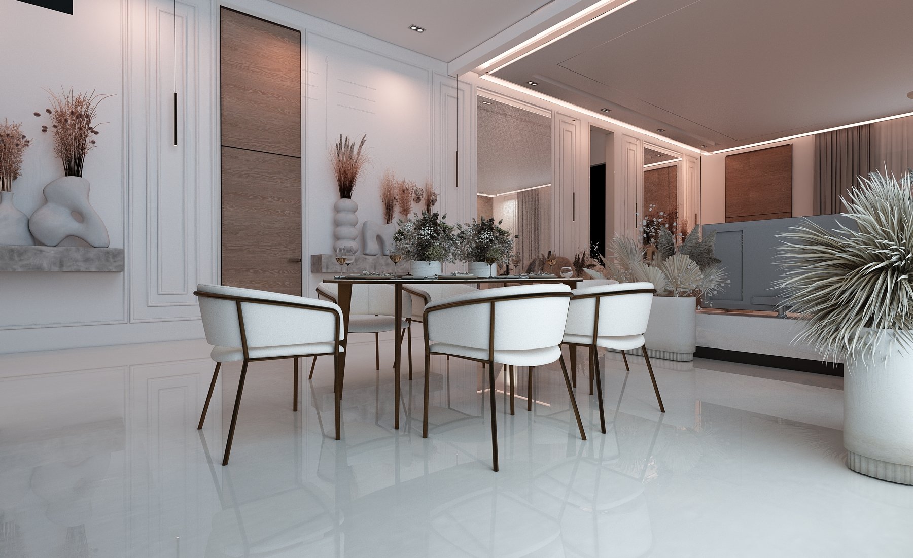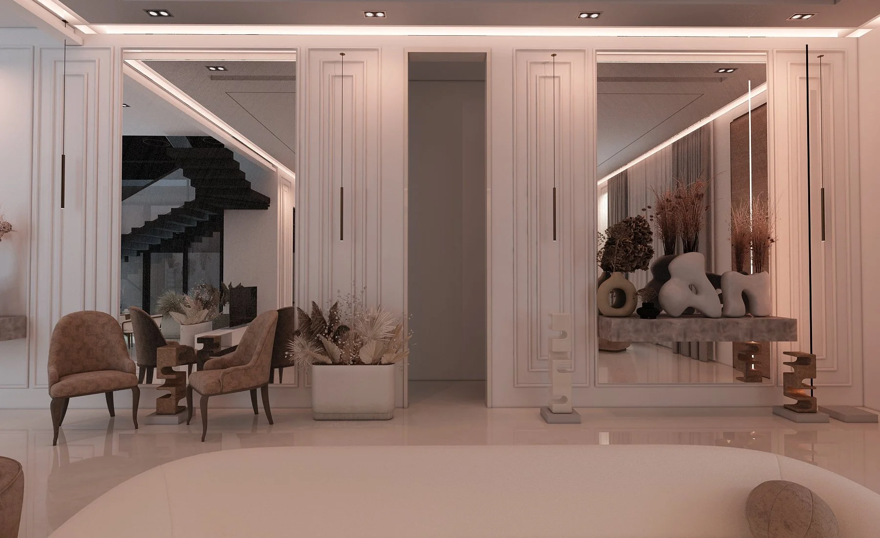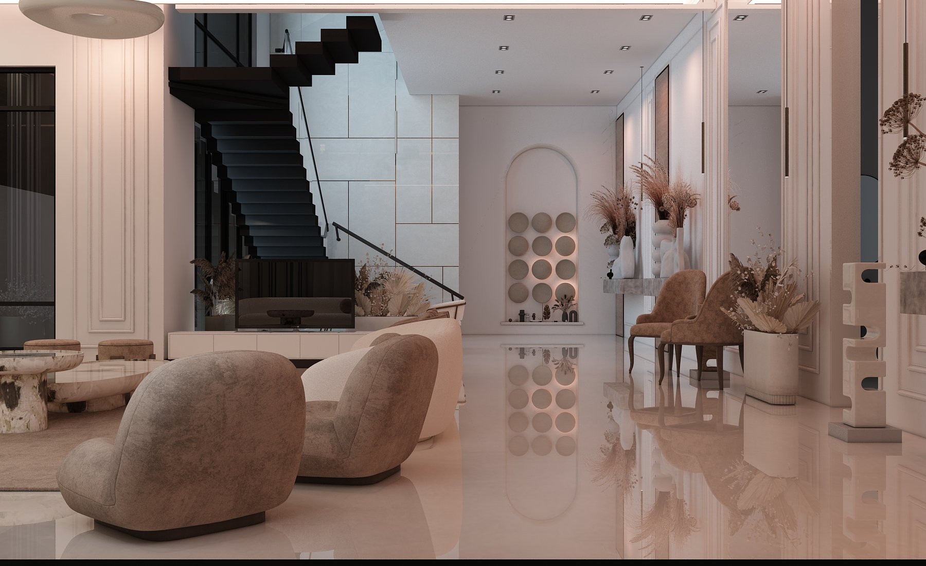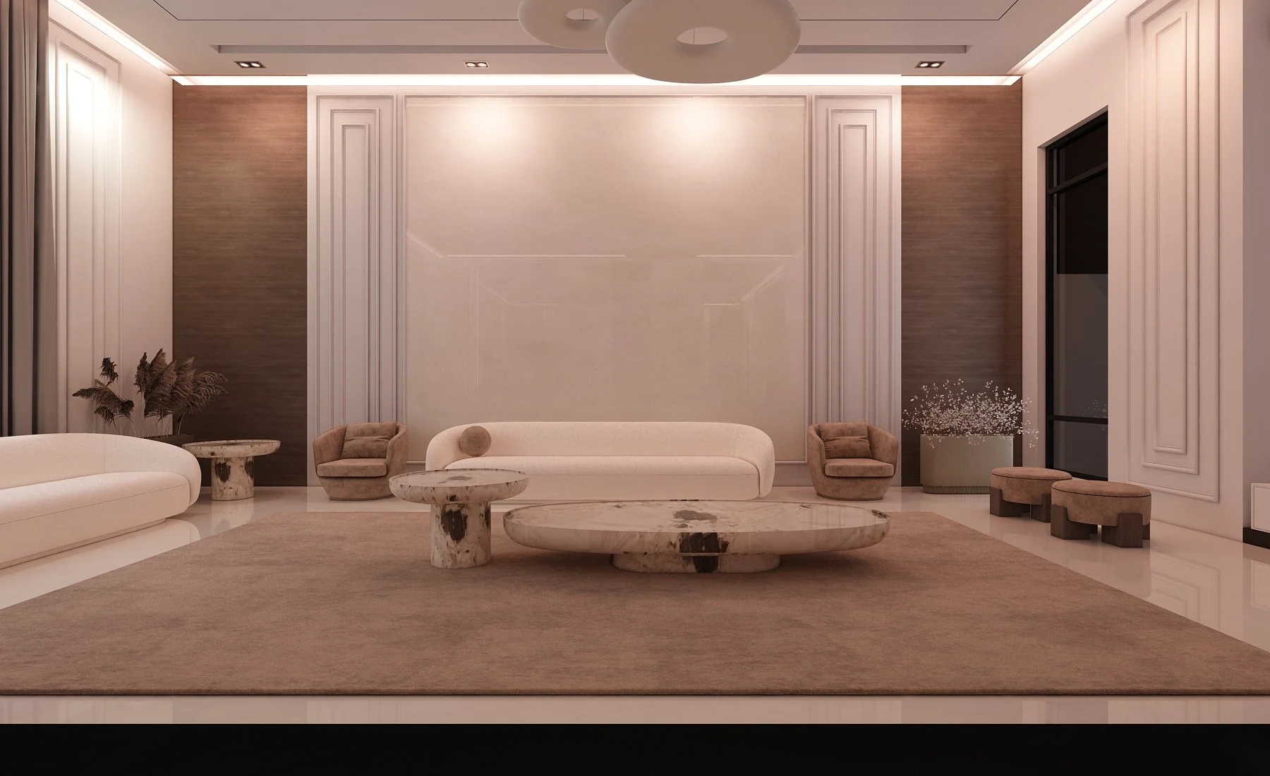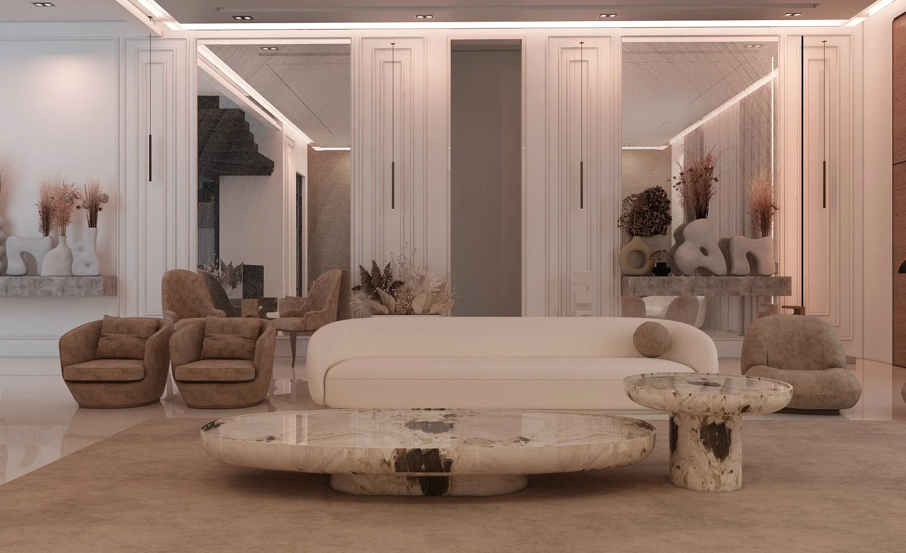 This living space exudes modern sophistication through a seamless balance of texture, tone, and form. A soft neutral palette is elevated by rich earthy accents, creating warmth and visual harmony. Sculptural furniture pieces, including marble statement tables and plush seating, bring a refined artistic touch while maintaining comfort and functionality. Subtle architectural detailing and ambient lighting enhance the room’s sense of depth and tranquility. Designed for both style and serenity, this space embodies contemporary elegance — where every element contributes to a calm, inviting atmosphere.