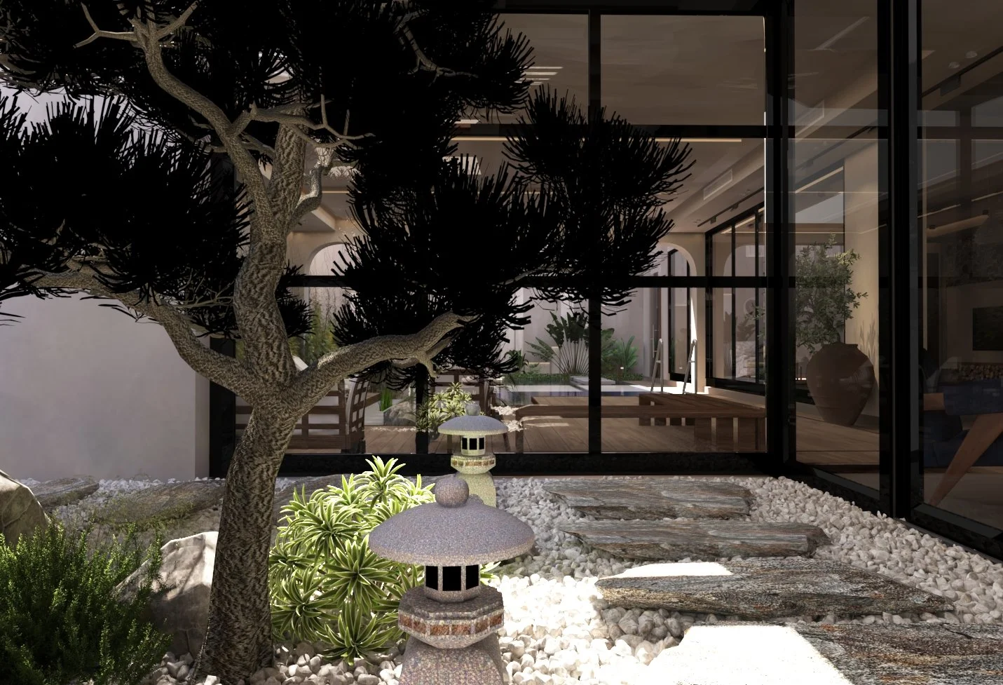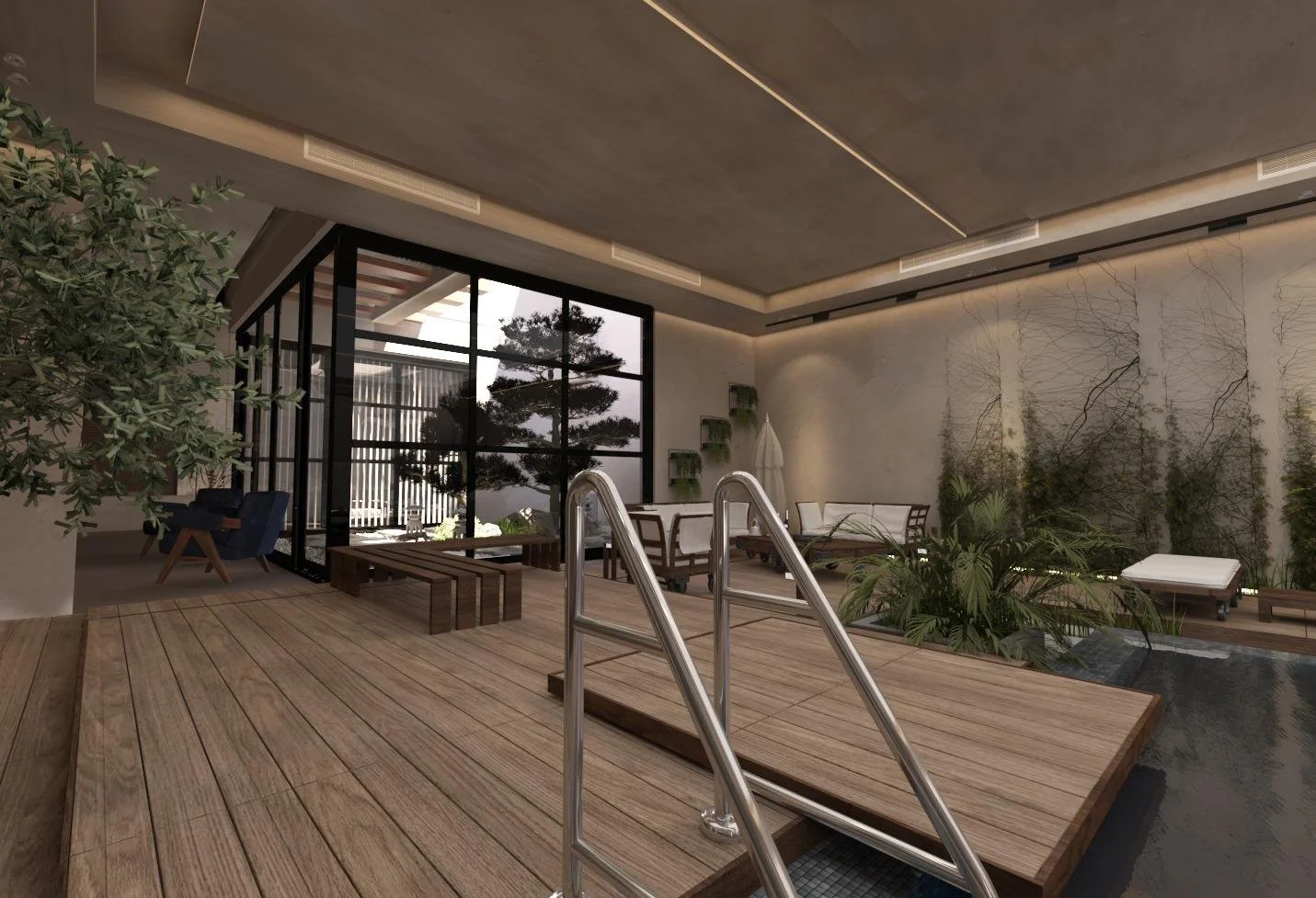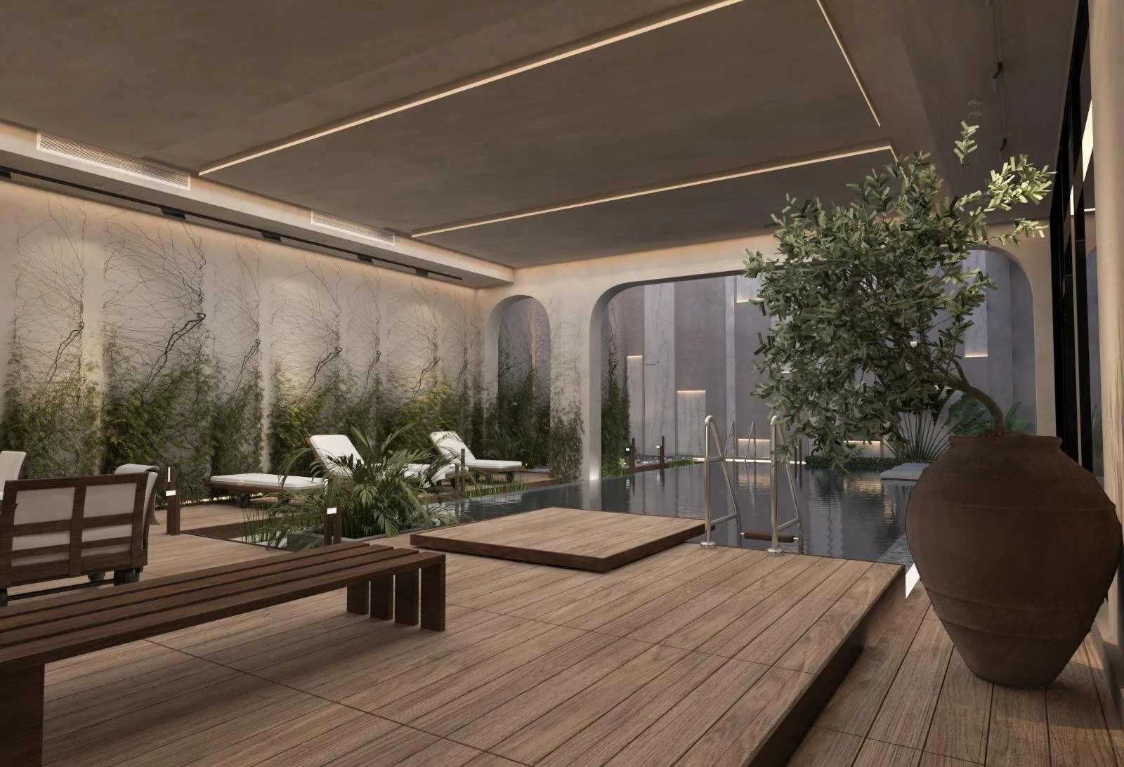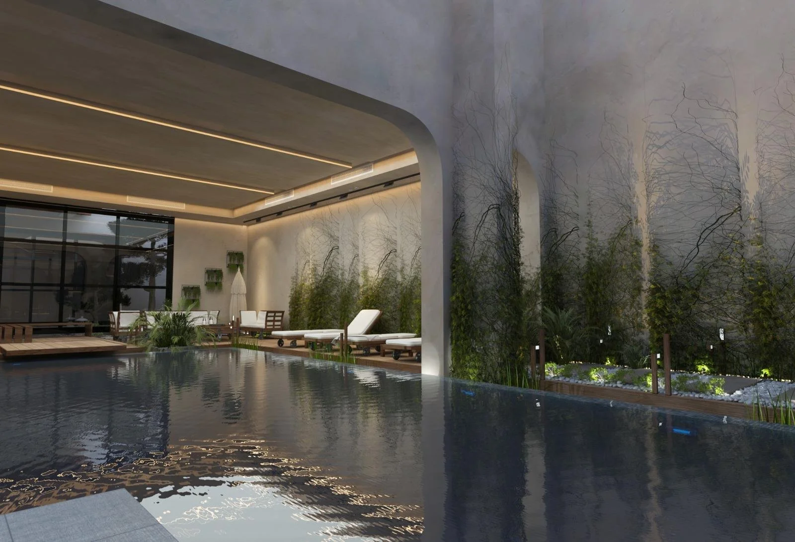This indoor pool space redefines the concept of serenity and luxury within a modern architectural context. Designed as a seamless extension of nature, the environment balances raw materials, soft lighting, and lush greenery to create an immersive sense of calm. The water’s surface mirrors the sculptural walls and vertical plantings, enhancing the tranquil atmosphere. Thoughtfully integrated lighting highlights the pool’s contours and the soft architectural curves, while natural elements—such as wood textures and green accents—bring warmth to the contemporary minimalism. The result is a refined wellness retreat that invites relaxation, reflection, and a connection to nature within a sophisticated, modern setting.